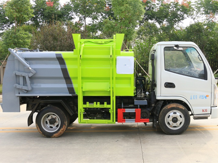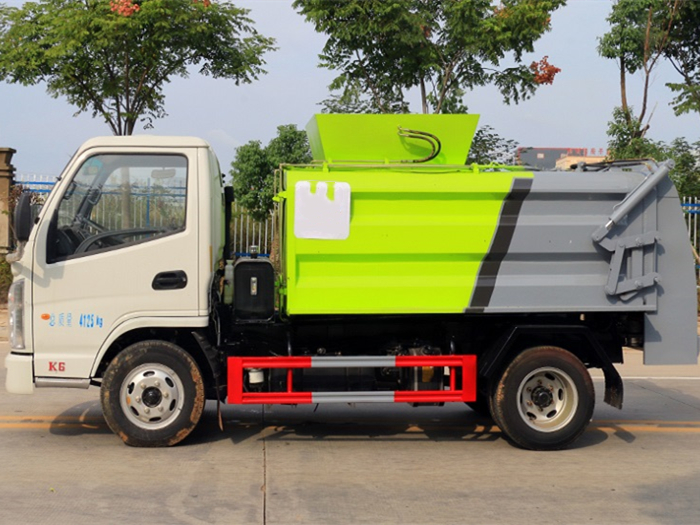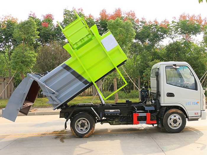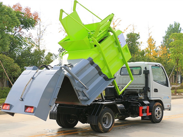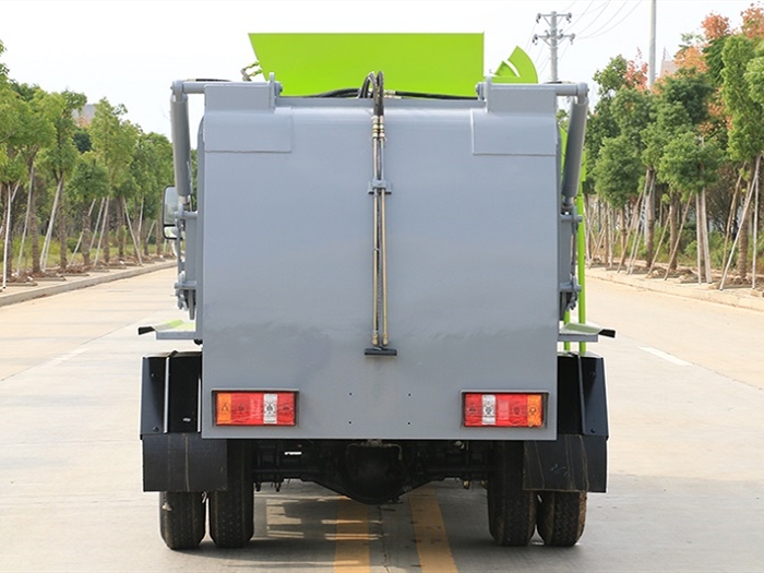罐體采用4mm優(yōu)質(zhì)鋼材制作,方形罐體,罐體容積3~3.5方,罐體與后蓋上部采用鉸鏈連接,后蓋可利用液壓油缸打開卸料;罐體右側(cè)前部裝有掛桶提升機(jī)構(gòu)裝卸桶裝垃圾,罐體底部安裝液壓油缸實(shí)現(xiàn)罐體舉升自卸。后蓋采用液壓開啟、鎖緊。操作方式為室外手動(dòng)液壓操作。
