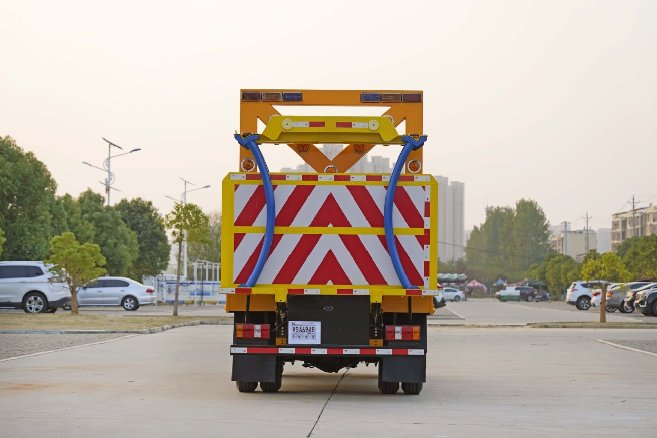 上裝配置:采用Q235國標(biāo)優(yōu)質(zhì)板材制作,貨箱尺寸:2580mm長*1950mm寬*450mm高,箱體后部防撞緩沖模塊包采用國際知名技術(shù)產(chǎn)品70K防撞緩沖模塊,防撞緩沖吸能模塊主要由車載防撞緩沖墊和導(dǎo)向標(biāo)志架組成,充當(dāng)施工作業(yè)車輛后方的緩沖衛(wèi)士。如若發(fā)生追尾事故,能夠在肇事車輛和前方施工作業(yè)區(qū)域之間構(gòu)建一個緩沖區(qū)域,通過機(jī)具結(jié)構(gòu)變形吸收撞擊的能量,最大限度地降低被保護(hù)人員及設(shè)備遭到碰撞的幾率。