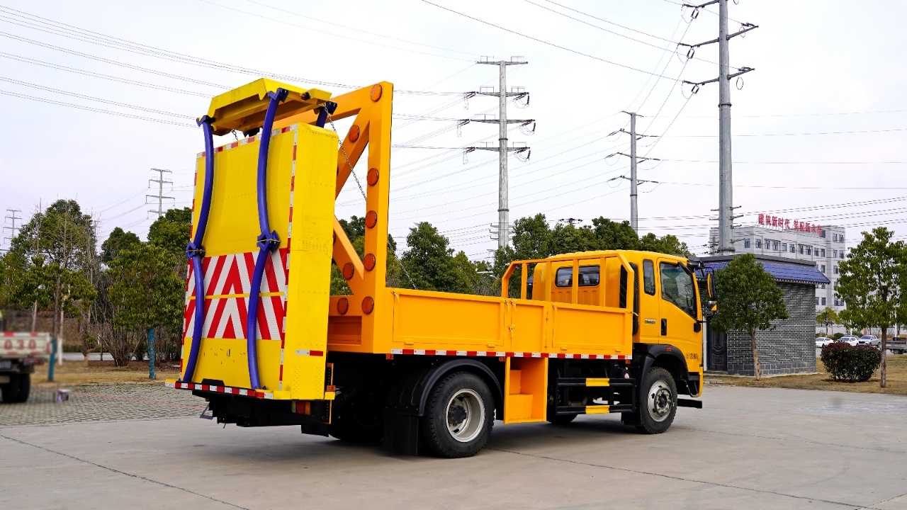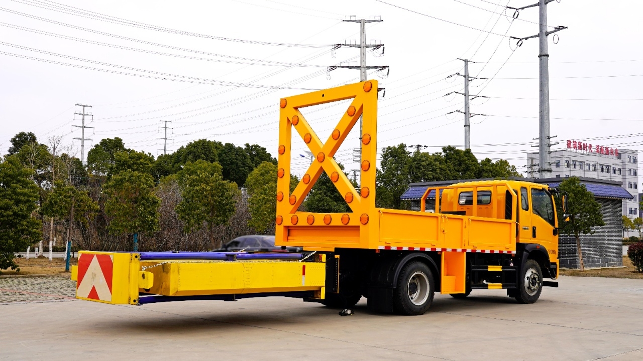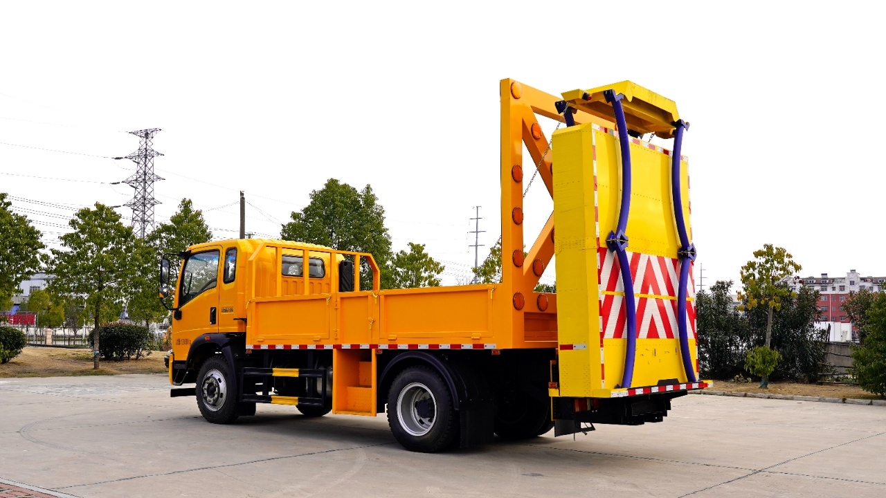 貨箱采用Q235國標優(yōu)質(zhì)碳鋼板,箱體后部防撞緩沖模塊包采用國際知名技術(shù)產(chǎn)品100K防撞緩沖模塊,防撞緩沖吸能模塊主要由車載防撞緩沖墊和導(dǎo)向標志架組成,充當(dāng)施工作業(yè)車輛后方的緩沖衛(wèi)士。 如若發(fā)生追尾事故,能夠在肇事車輛和前方施工作業(yè)區(qū)域之間構(gòu)建一個緩沖區(qū)域,通過機具結(jié)構(gòu)變形吸收撞擊的能量,最大限度地降低被保護人員及設(shè)備遭到碰撞的幾率。高性能液壓系統(tǒng),可實現(xiàn)快速舉升和落下操作。