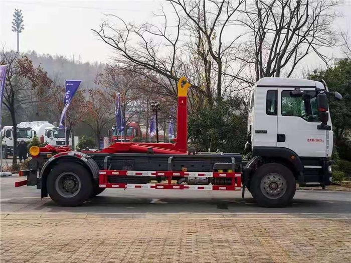 重汽汕德卡單橋勾臂垃圾車,垃圾斗容積10方(4500軸距),一體式主臂,鑄造托架,鍛造拖輪,選裝PLC**系統(tǒng),不銹鋼垃圾斗。