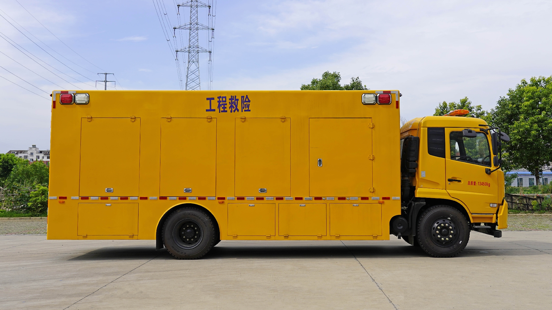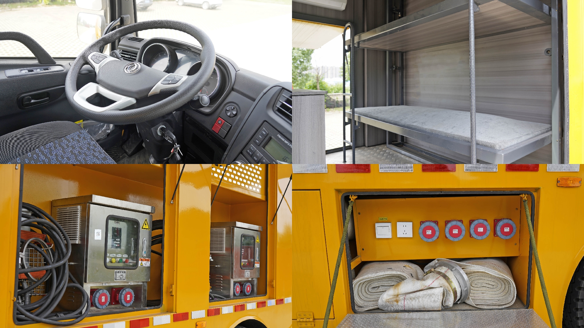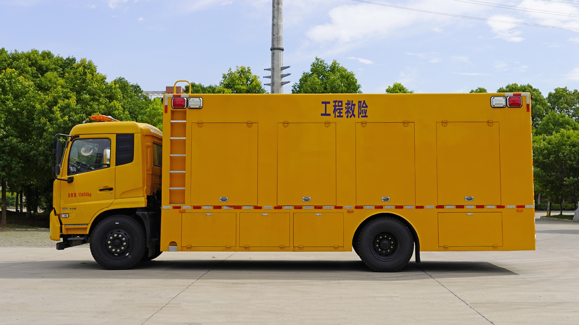 該車專用裝置:發(fā)電機(jī)組,電纜卷盤,控制系統(tǒng)等;用于應(yīng)急搶險;左、右兩側(cè)安裝作業(yè)警示燈,該燈用于作業(yè)時警示,只能在車輛切換為作業(yè)狀態(tài)時使用.隨底盤選裝限速裝置,限速89km/h.ABS型號/生產(chǎn)廠家:3631010-C2000/東科克諾爾商用車制動系統(tǒng)(十堰)有限公司,ABS 8/東科克諾爾商用車制動系統(tǒng)(十堰)有限公司, ABS-E 4S/4M/采埃孚商用車系統(tǒng)(青島)有限公司,J ABS/焦作博瑞克控制技術(shù)有限公司;側(cè)、后防護(hù)均為裙邊結(jié)構(gòu)代替,后部離地高度為420mm;車廂頂部封閉且不可開啟.該車選用4700mm,5000mm軸距,整車長/軸距/前懸/后懸對應(yīng)關(guān)系(mm):8900/4700/1400(1430)/2800(2770),9200/5000/1400(1430)/2800(2770).隨底盤選裝駕駛室樣式. |