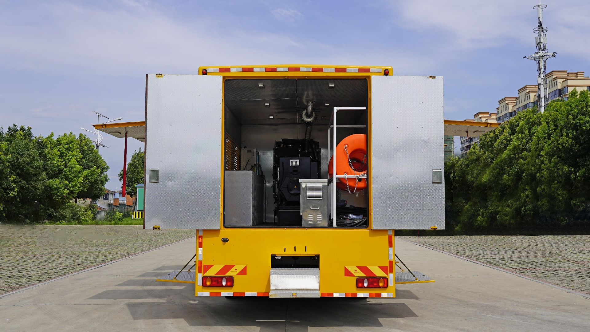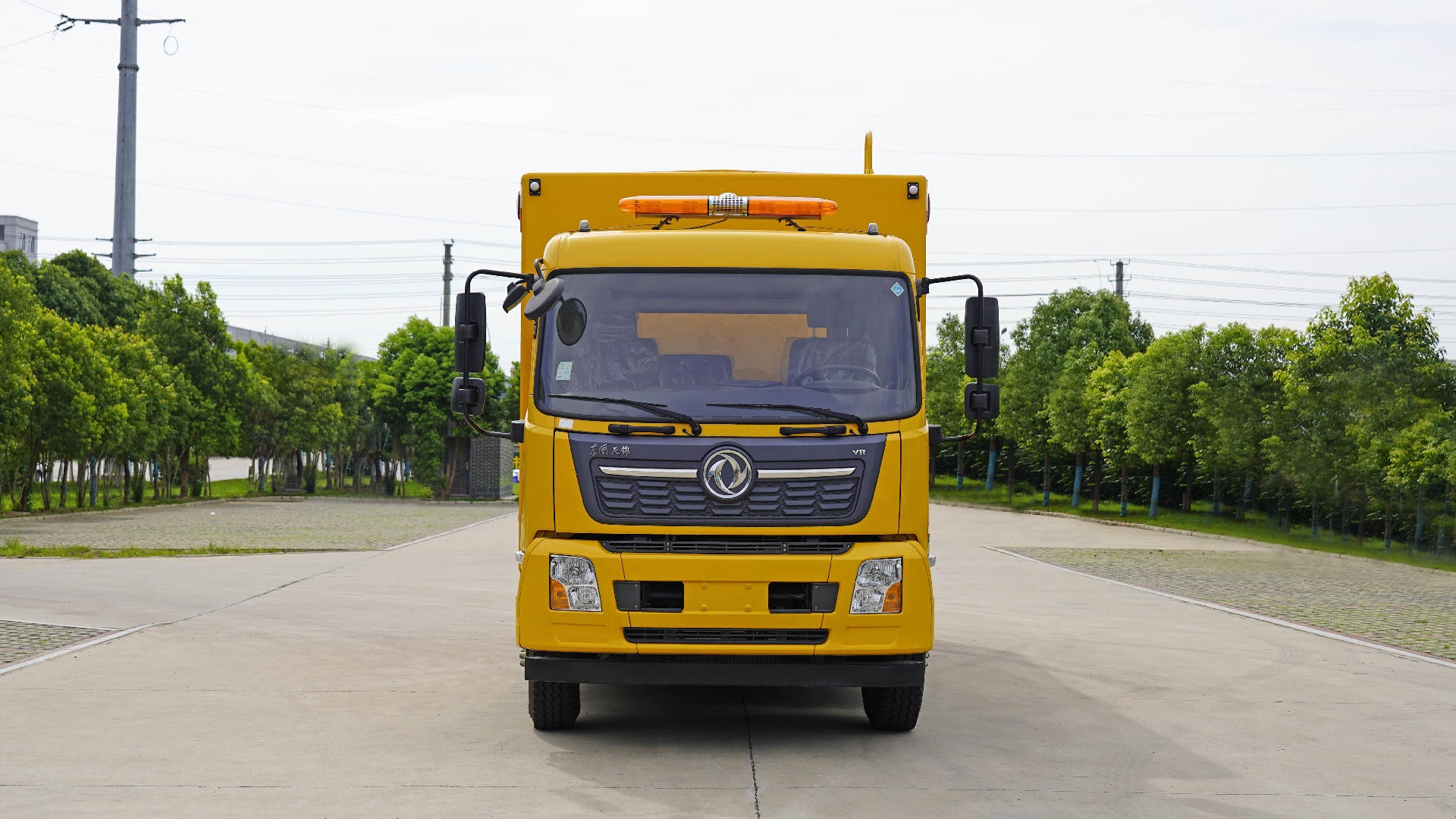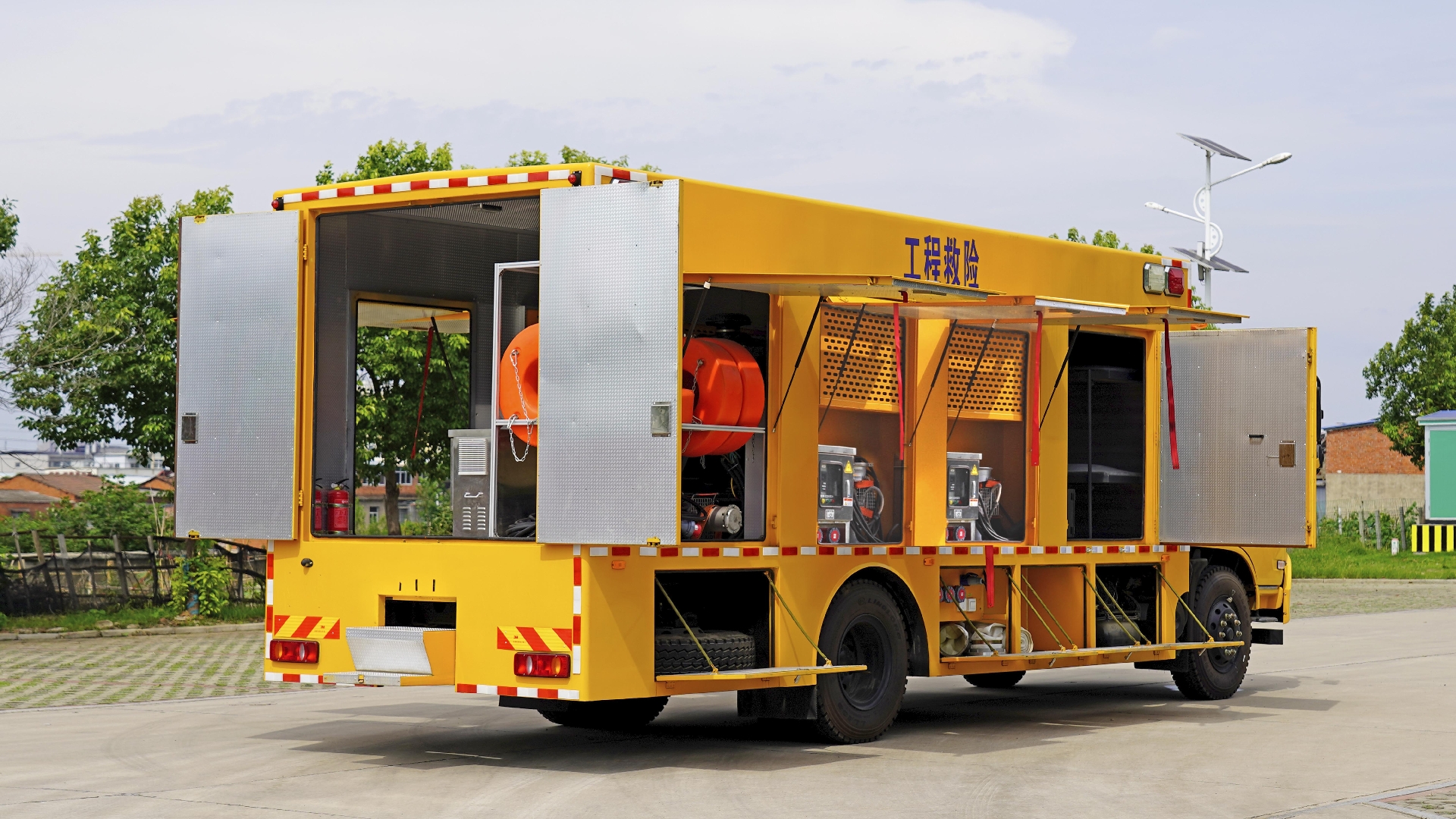該車專用裝置:發(fā)電機(jī)組,電纜卷盤,控制系統(tǒng)等;用于應(yīng)急搶險;左、右兩側(cè)安裝作業(yè)警示燈,該燈用于作業(yè)時警示,只能在車輛切換為作業(yè)狀態(tài)時使用.隨底盤選裝限速裝置,限速89km/h.ABS型號/生產(chǎn)廠家:3631010-C2000/東科克諾爾商用車制動系統(tǒng)(十堰)有限公司,ABS 8/東科克諾爾商用車制動系統(tǒng)(十堰)有限公司, ABS-E 4S/4M/采埃孚商用車系統(tǒng)(青島)有限公司,J ABS/焦作博瑞克控制技術(shù)有限公司;側(cè)、后防護(hù)均為裙邊結(jié)構(gòu)代替,后部離地高度為420mm;車廂頂部封閉且不可開啟.該車選用4700mm,5000mm軸距,整車長/軸距/前懸/后懸對應(yīng)關(guān)系(mm):8900/4700/1400(1430)/2800(2770),9200/5000/1400(1430)/2800(2770).隨底盤選裝駕駛室樣式. |