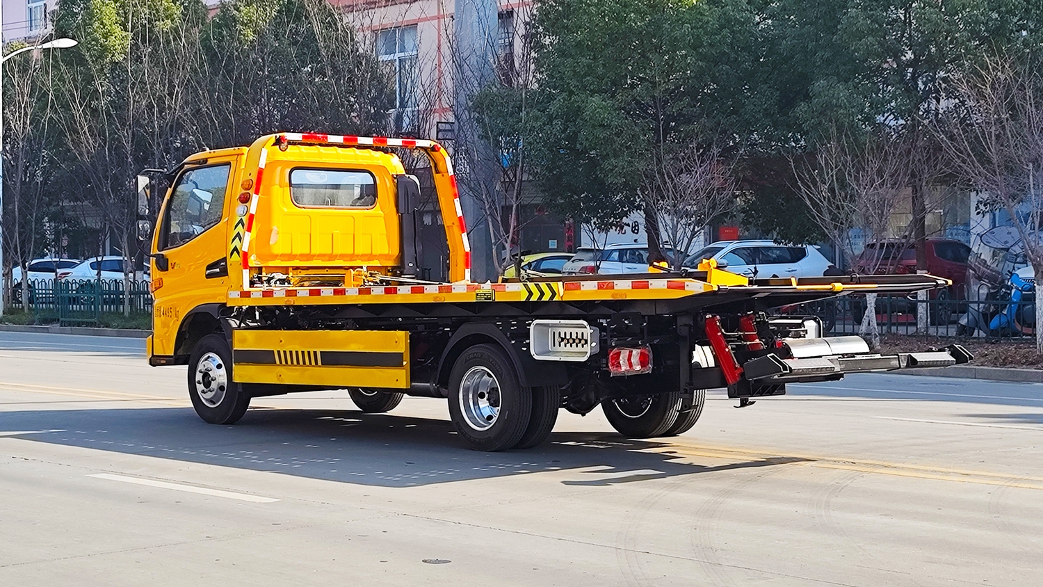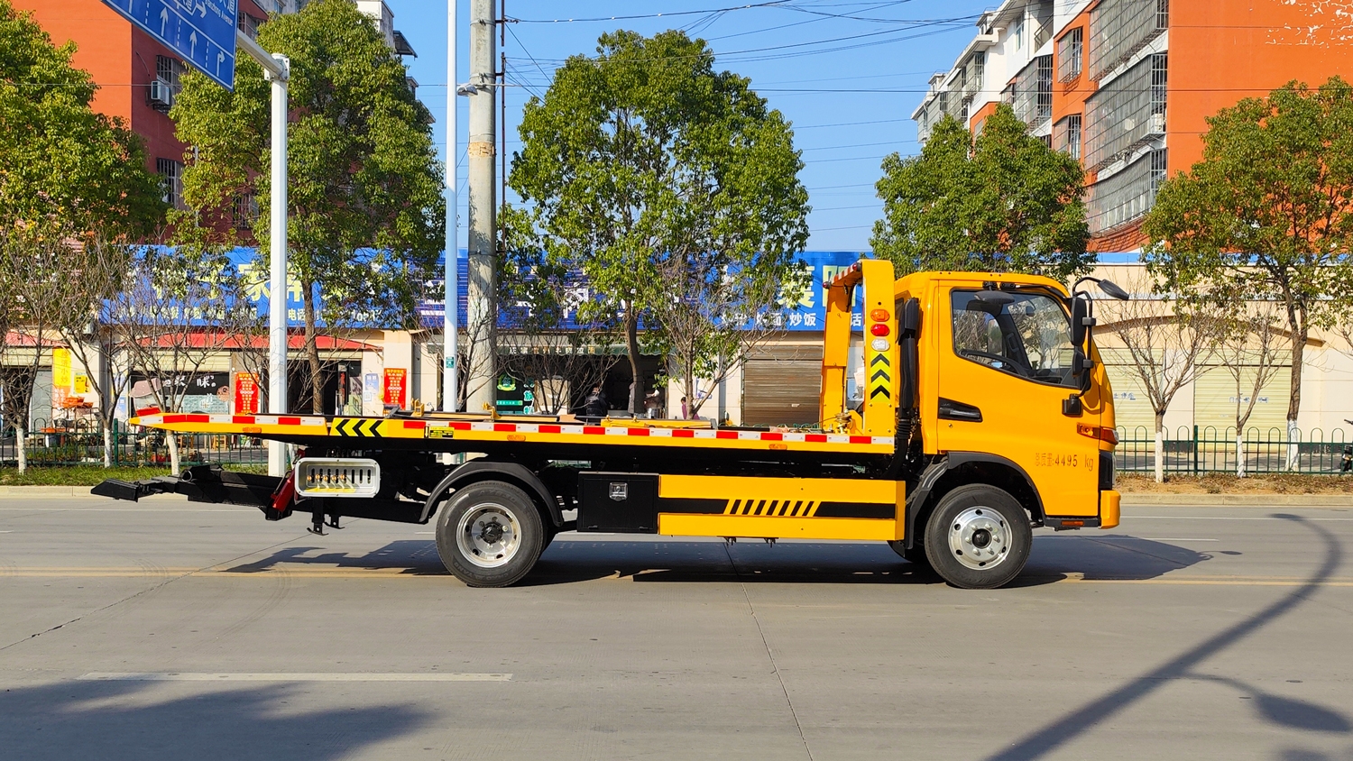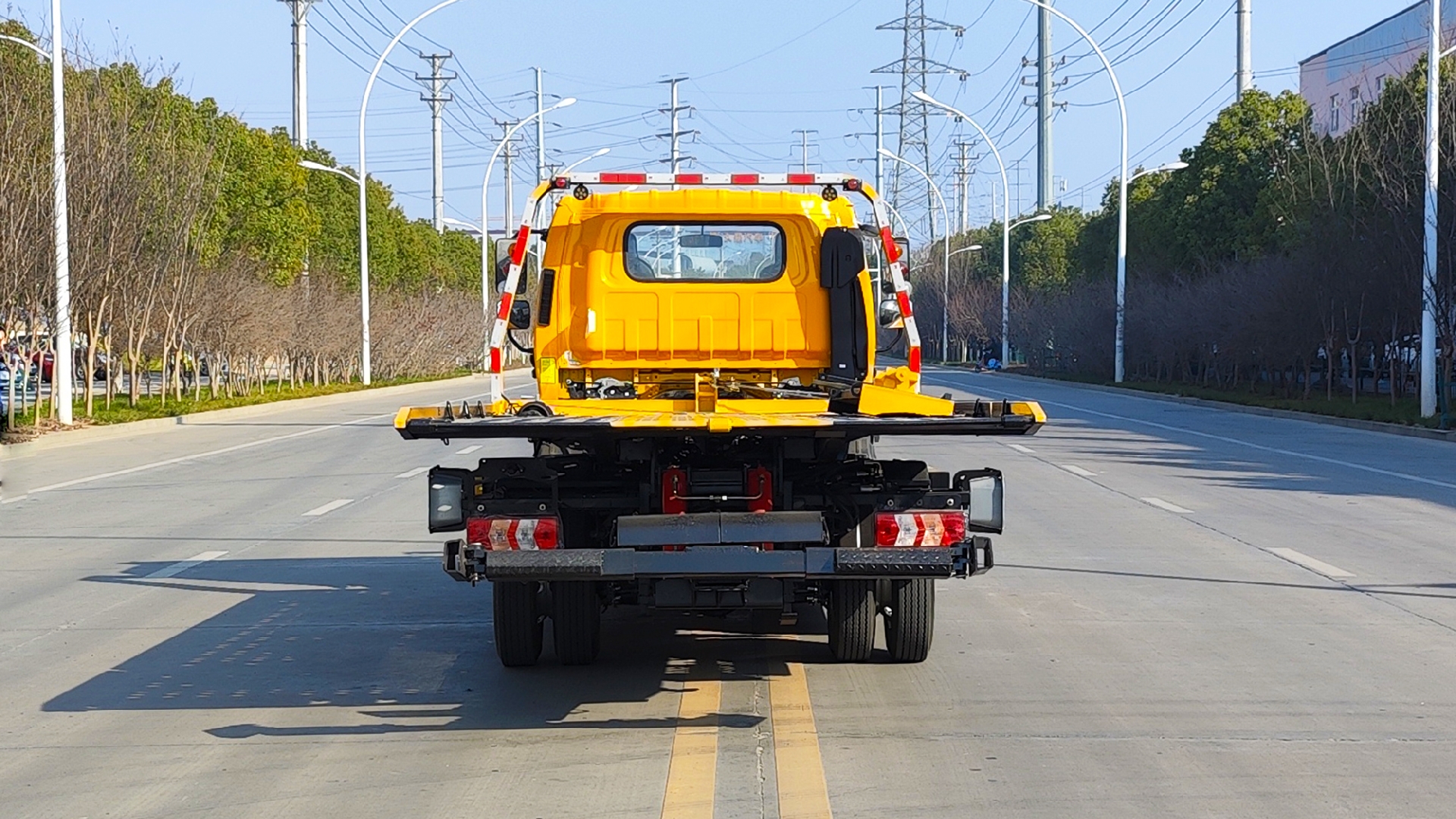 上裝配置:一體板,采用高強鋼沖孔板,雙側操作裝置 ,1個4噸液壓絞盤(25米鋼絲繩),1個工具箱,擋胎2個,4根綁帶。板長:5.3米,寬:2.3米(上裝可承載2.5噸)可加裝后托臂總成一套,七字叉一對,抱胎桶一對。油漆:拋丸,噴粉,烤漆