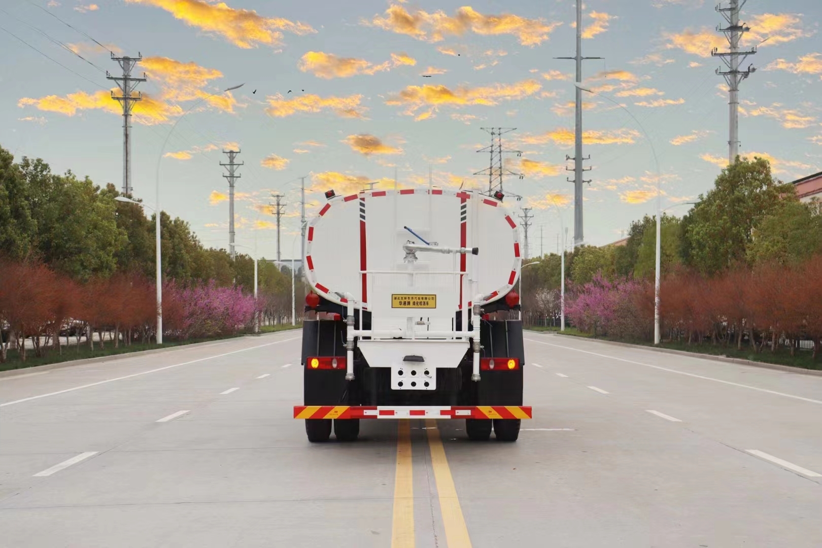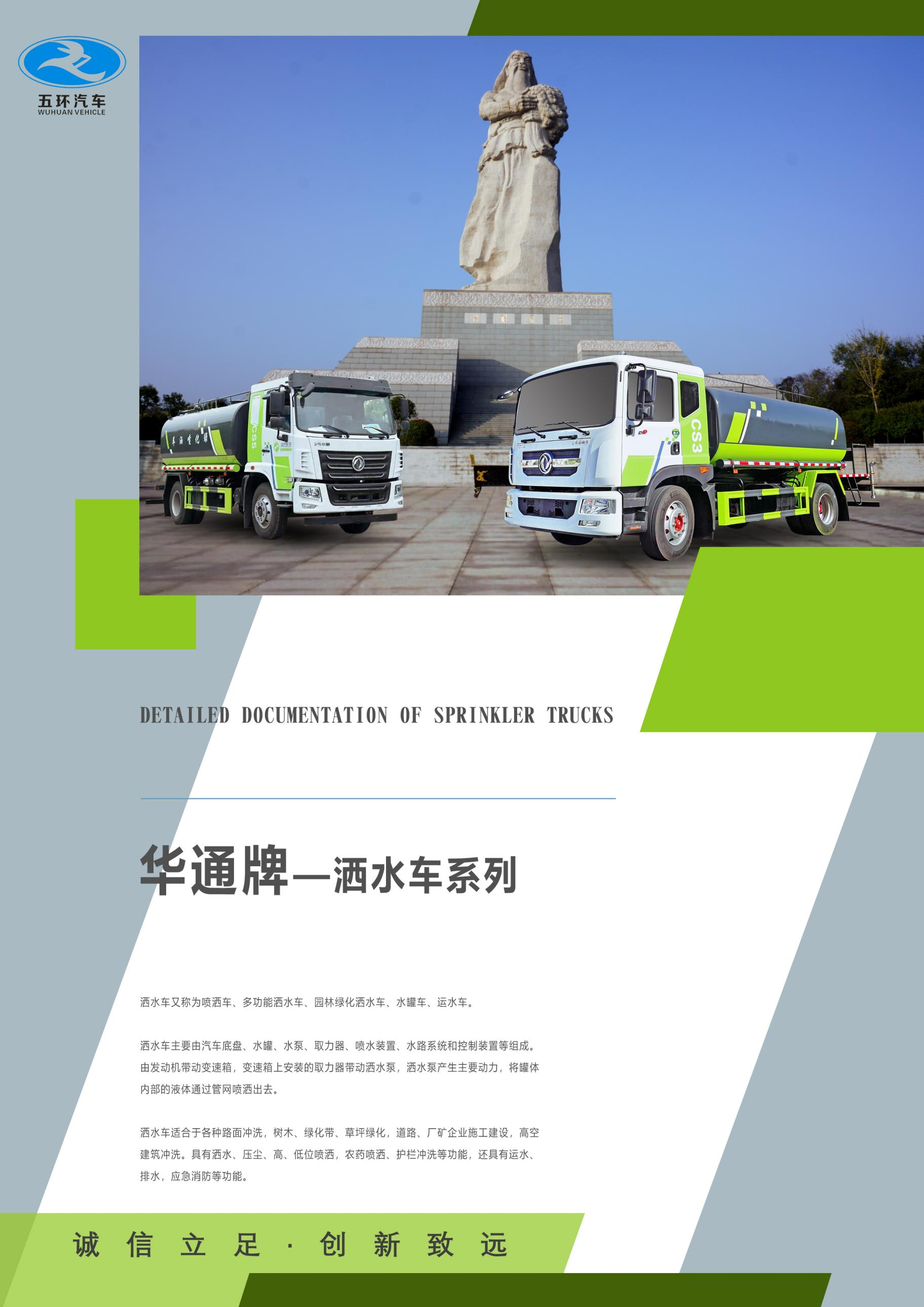 我公司生產(chǎn)灑水車,標配前沖、后灑、側(cè)噴、后置式工作平臺、平臺上有高壓水炮(可360°旋轉(zhuǎn),可調(diào)成柱狀最大射程35米,也可調(diào)成霧狀最大射程15米,可調(diào)成:直沖狀、大雨、中雨、小雨、毛毛雨),配備優(yōu)質(zhì)大功率專用灑水泵,取力器,雜物過濾網(wǎng),國標通用65型消防接口(可通過消防栓加水)、1套自流球閥系統(tǒng)(可自吸自排,可從河里或池塘抽水到罐體,最大吸程7米),2根引水鋼絲膠管。水泵、取力器、球閥、濾網(wǎng)均為國家標準產(chǎn)品,主管道加粗,法蘭墊、法蘭盤加厚,萬向前沖,大通徑球閥,具有性能優(yōu)良,工作可靠、效率高、流量大、維修方便等特點。