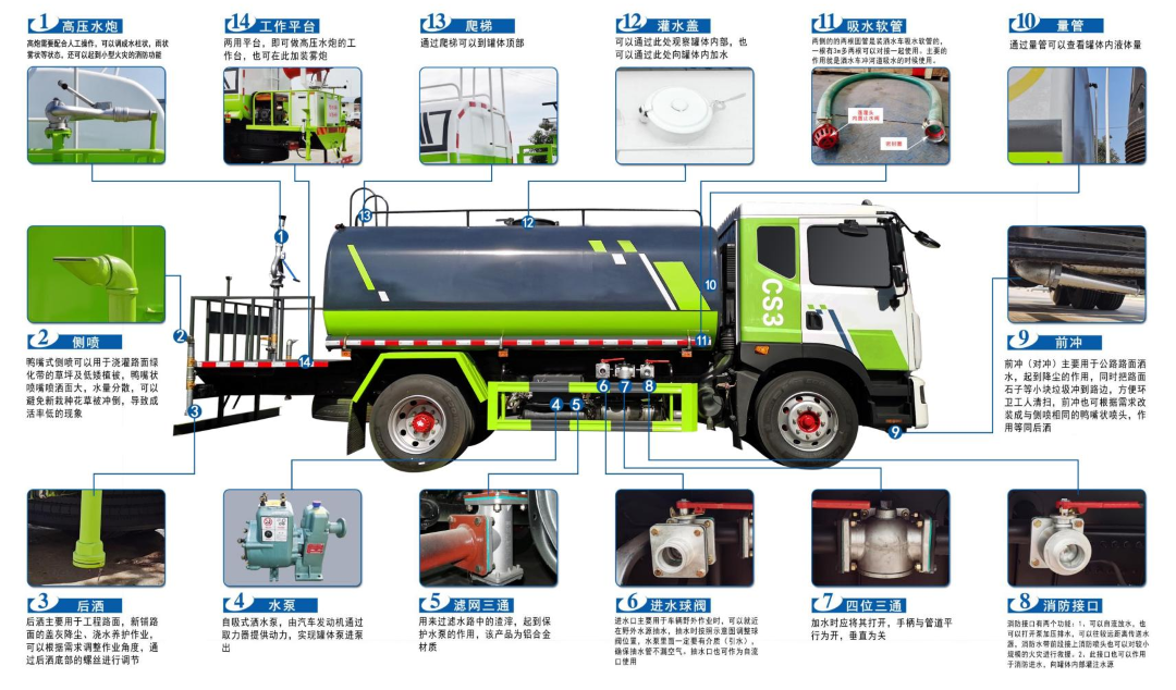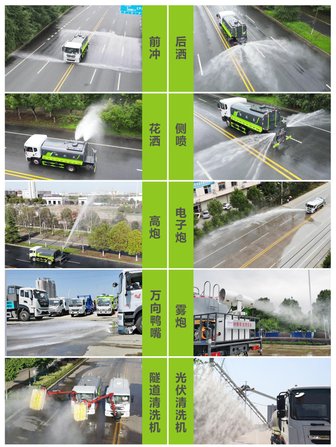 灑水車適合于各種路面沖洗,樹木、綠化帶、草坪綠化,道路、廠礦企業(yè)施工建設(shè),高空建筑沖洗。具有灑水、壓塵、高、低位噴灑,農(nóng)藥噴灑、護欄沖洗等功能,還具有運水、排水,應(yīng)急消防等功能。
