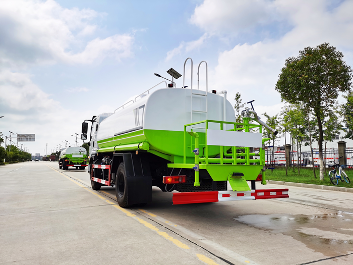 改裝配置:罐體用4MM碳鋼板制作,罐內(nèi)隔板具有防波作用,以減低汽車行駛時(shí)罐體液體的沖擊。整車帶一個(gè)專用灑水泵(垂直最大吸程6米),灑水寬度14米,射程28米。多功能灑水車配備2個(gè)前沖(噴)(能將路面泥巴、塵土、垃圾沖干凈);2個(gè)后灑(能均勻地將水灑在路面,一次灑水寬度14米)、2個(gè)側(cè)噴(花灑)(能均勻地將路旁綠化帶澆灌)、帶1個(gè)后工作平臺(tái),平臺(tái)上安裝1個(gè)綠化灑水高炮(灑水炮可全方位旋轉(zhuǎn),可連續(xù)調(diào)成直沖狀、大雨、小雨、毛毛雨,霧狀可調(diào)節(jié)沖洗高大樹木),引水時(shí)間<5min,流量90m3/h。帶1個(gè)消防接頭,帶1個(gè)自流閥,1個(gè)過濾裝置、人性化爬梯及側(cè)防護(hù)欄,安裝灑水音樂喇叭。