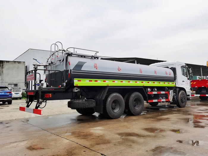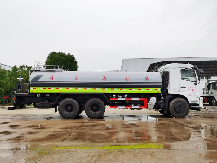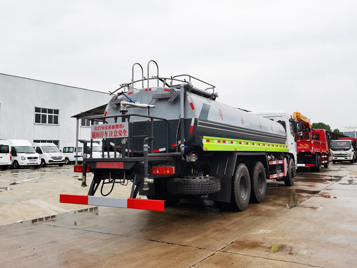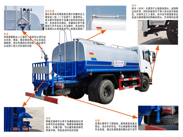 罐體尺寸:6900*2300*1350mm,天億50/110水泵,可自吸自排,水泵垂直吸程≧7米,抽滿一罐水時(shí)間:10分鐘左右,可連續(xù)噴灑作業(yè)3-4小時(shí)。武鋼優(yōu)質(zhì)碳鋼制作罐體,罐體厚度4mm,主管道76,前沖改萬象鴨嘴,加裝中沖,后尾部加弧形噴霧,后灑、側(cè)噴、高位花灑、后工作平臺、360度可調(diào)節(jié)綠化水炮,自流閥、濾網(wǎng)、消防接口(可連接消防栓取水,可作應(yīng)急消防用),罐前量管(觀察罐內(nèi)水位)、罐后爬梯、罐上簡易罐口、帶簡易護(hù)欄、罐側(cè)雙炮筒、炮筒內(nèi)3米長鋼絲塑膠抽水管兩根,罐體表面雙層油漆工藝,防銹、耐腐蝕,其余由廠家標(biāo)配。