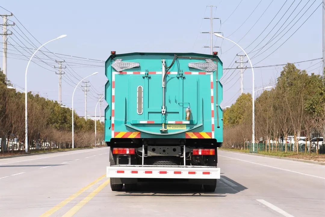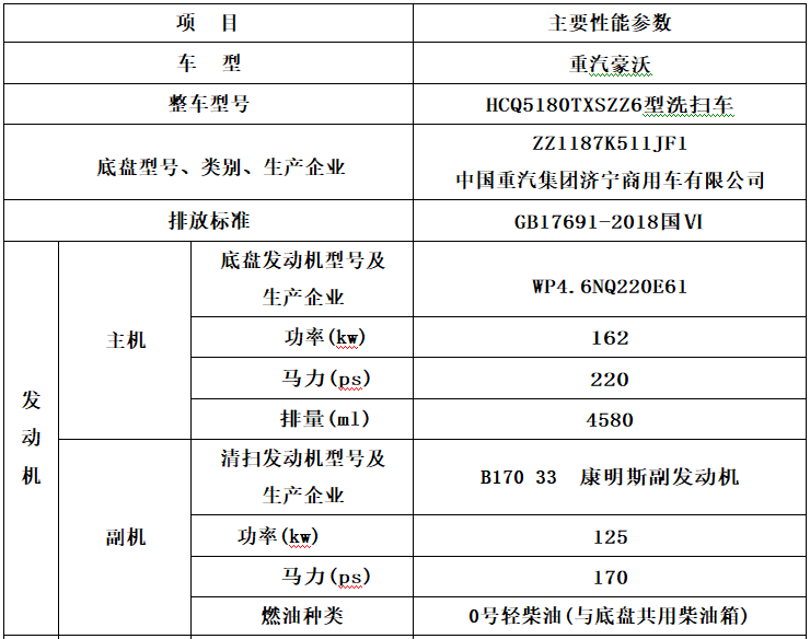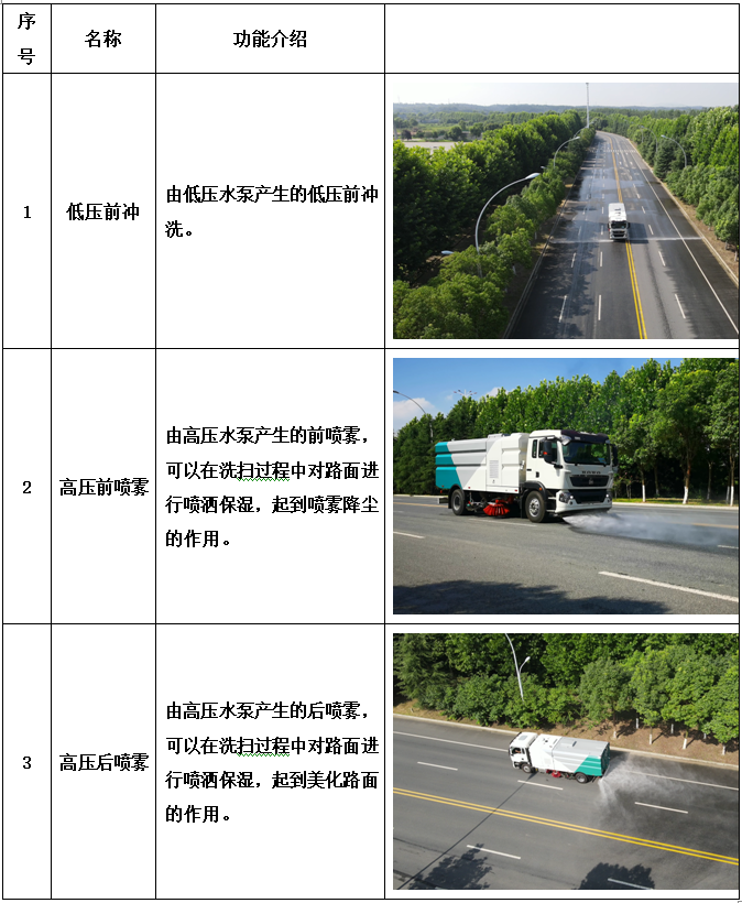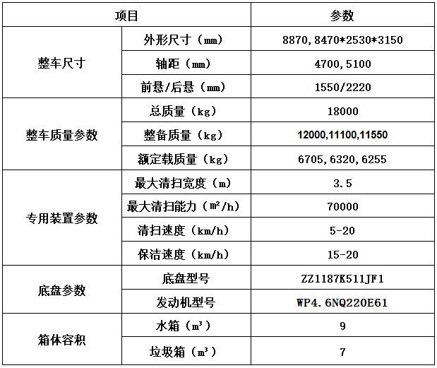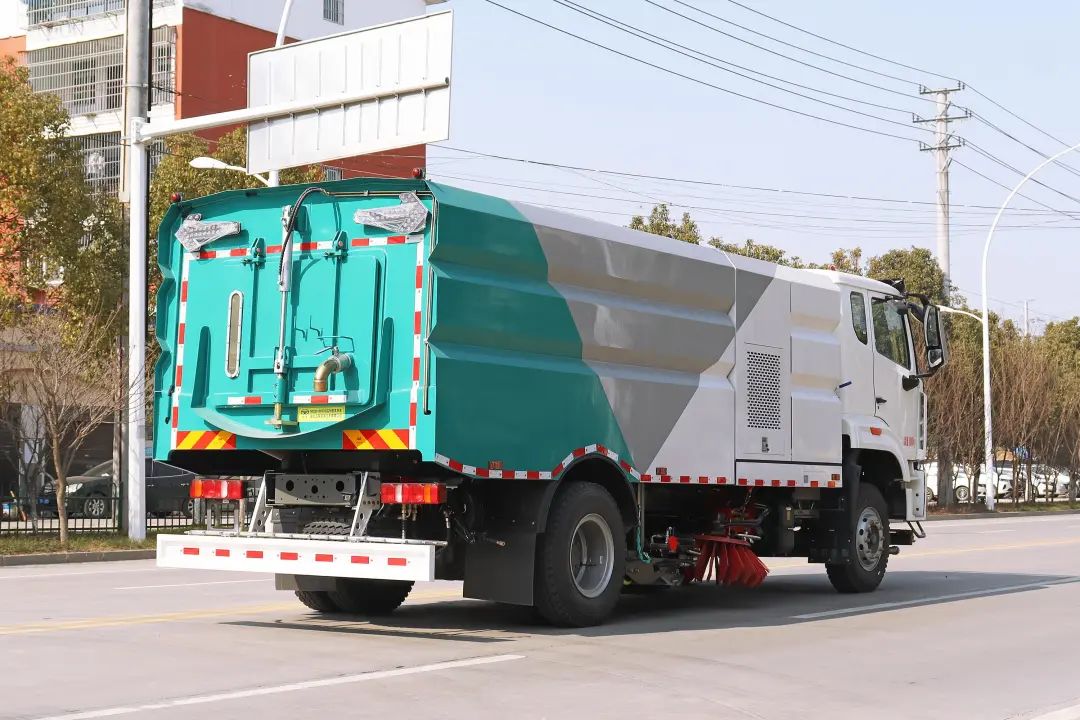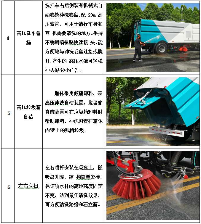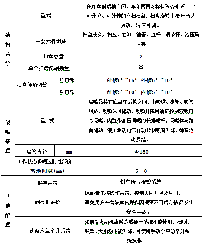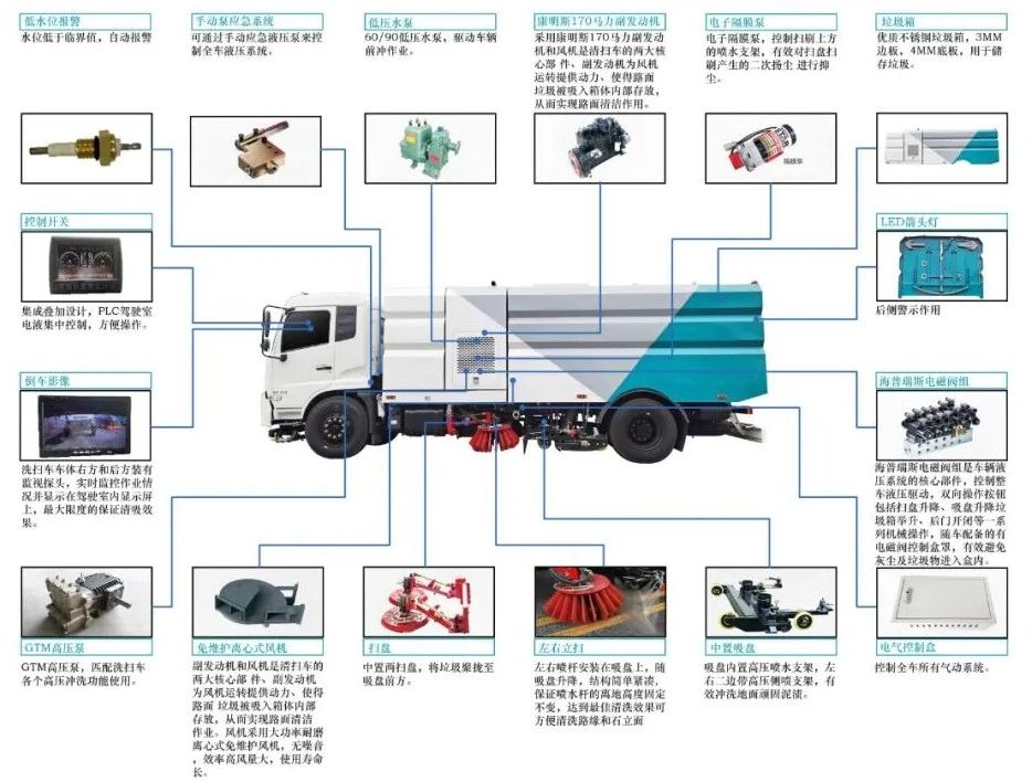 加裝副發(fā)動機、風(fēng)機、高壓水泵、清水箱、垃圾箱、左右立掃、帶噴水桿的寬吸嘴、低壓沖洗系統(tǒng)、掃盤降塵系統(tǒng)、液壓系統(tǒng)、專用裝置電控系統(tǒng)和副車架等改裝而成,副發(fā)動機采用康明斯170馬力副發(fā)動機,帶2個中置掃盤,力沃馬達,低壓水泵,GTM高壓水泵(前沖側(cè)噴中噴后噴霧沖洗水槍垃圾箱自潔裝置);高壓路沿清洗噴頭;不銹鋼垃圾箱;不銹鋼管高壓管路;PLC一鍵控制;尾部LED箭頭燈;垃圾箱、水箱均帶防溢低水位報警裝置;倒車及洗掃狀態(tài)室內(nèi)監(jiān)視器。20米沖洗卷盤。水箱9方,垃圾箱7立方。