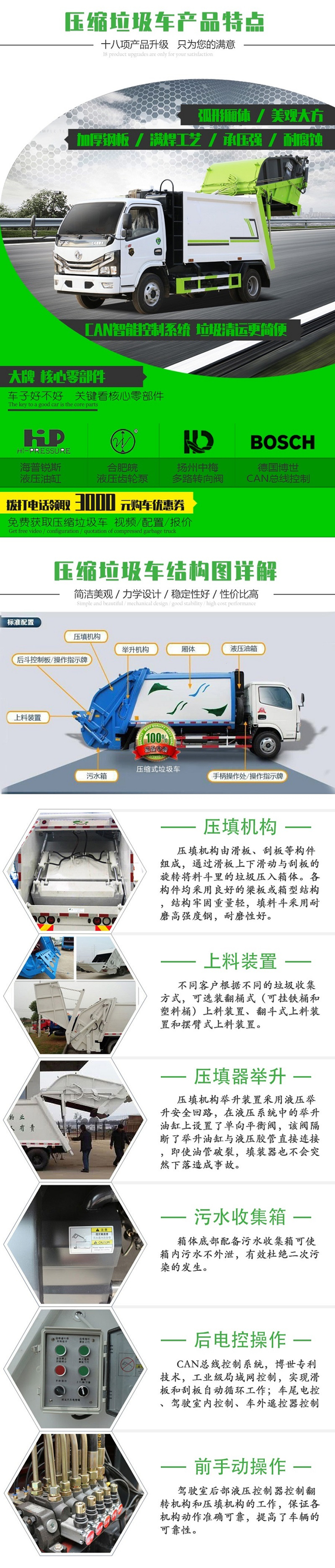采用武鋼優(yōu)質(zhì)碳鋼板材,邊四底四厚度,箱體有效容積4立方,前推后翻,刮板,手電雙控,帶PLC全自動(dòng)操作,帶污水處理箱,尾部帶掛桶垃圾桶翻轉(zhuǎn)機(jī)構(gòu),嚴(yán)格按照**公告制作,帶**免征公告,環(huán)保公告。隨車提供資料:機(jī)動(dòng)車上戶票,底盤(pán)合格證,整車合格證,隨車工具,服務(wù)手冊(cè),保修手冊(cè)。