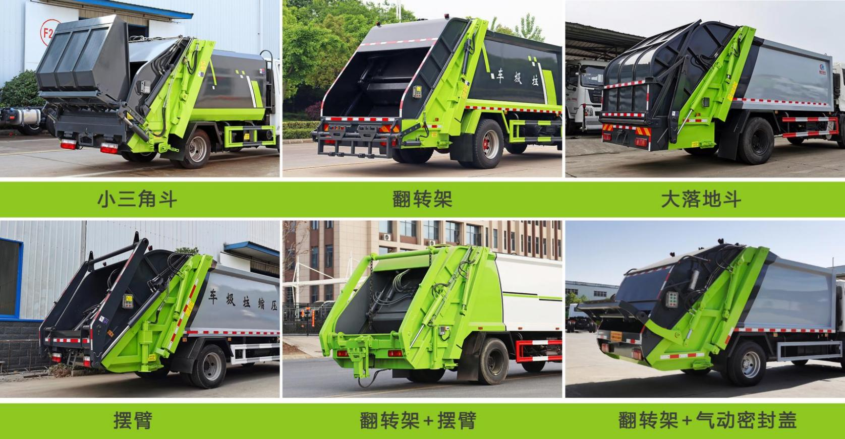 不同用戶可根據(jù)不同的垃圾收集方式,選裝不用的翻桶(斗)機(jī)構(gòu):掛桶式翻轉(zhuǎn)(可掛鐵桶塑料垃圾桶等)、簸箕斗式翻轉(zhuǎn)、擺臂式翻轉(zhuǎn)(可配落地斗)機(jī)構(gòu)等。