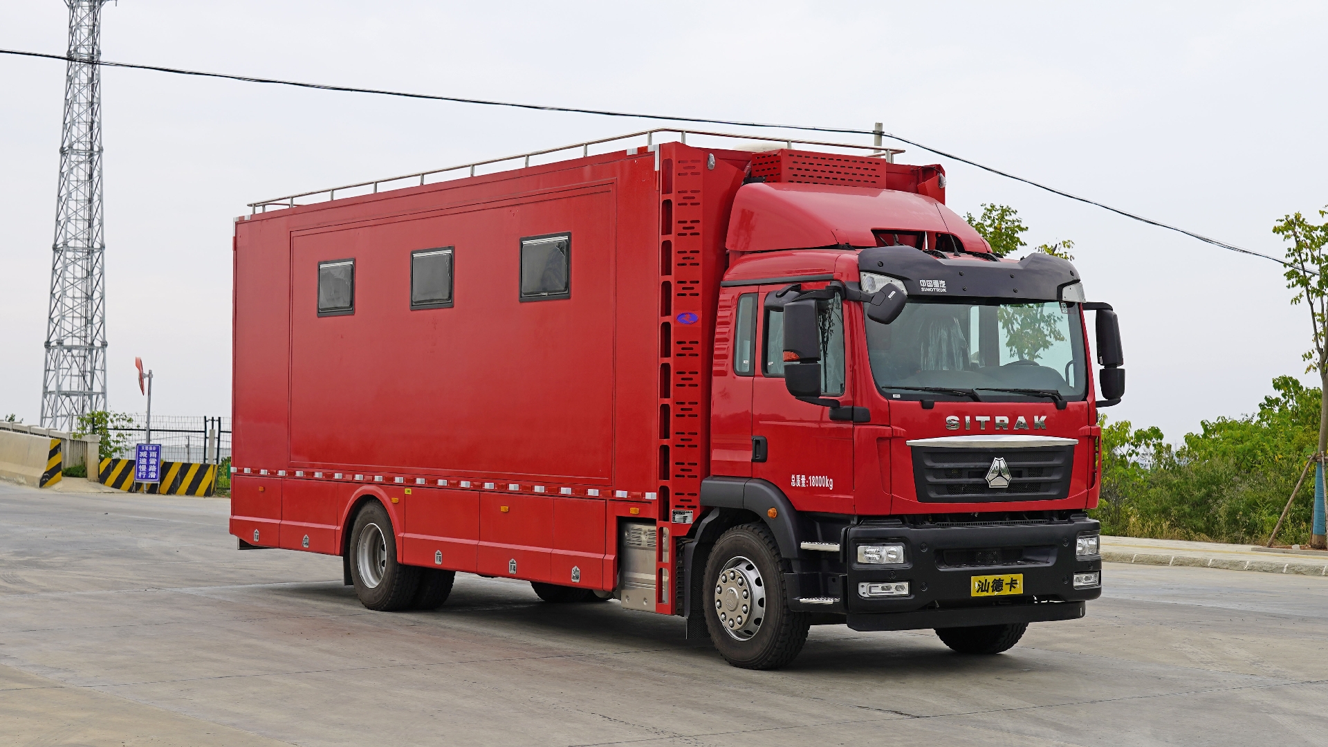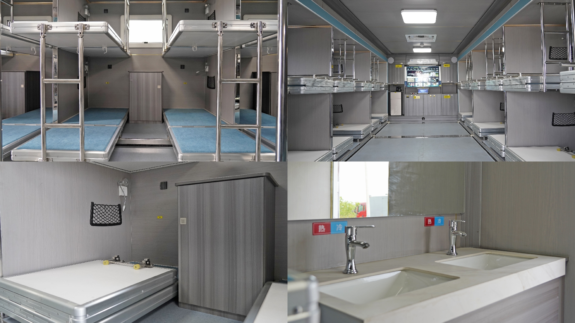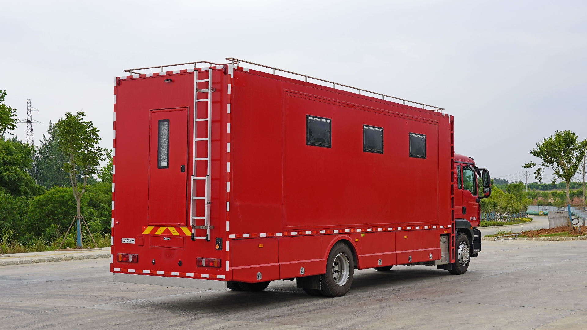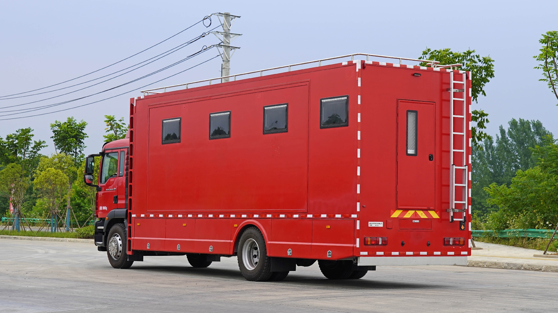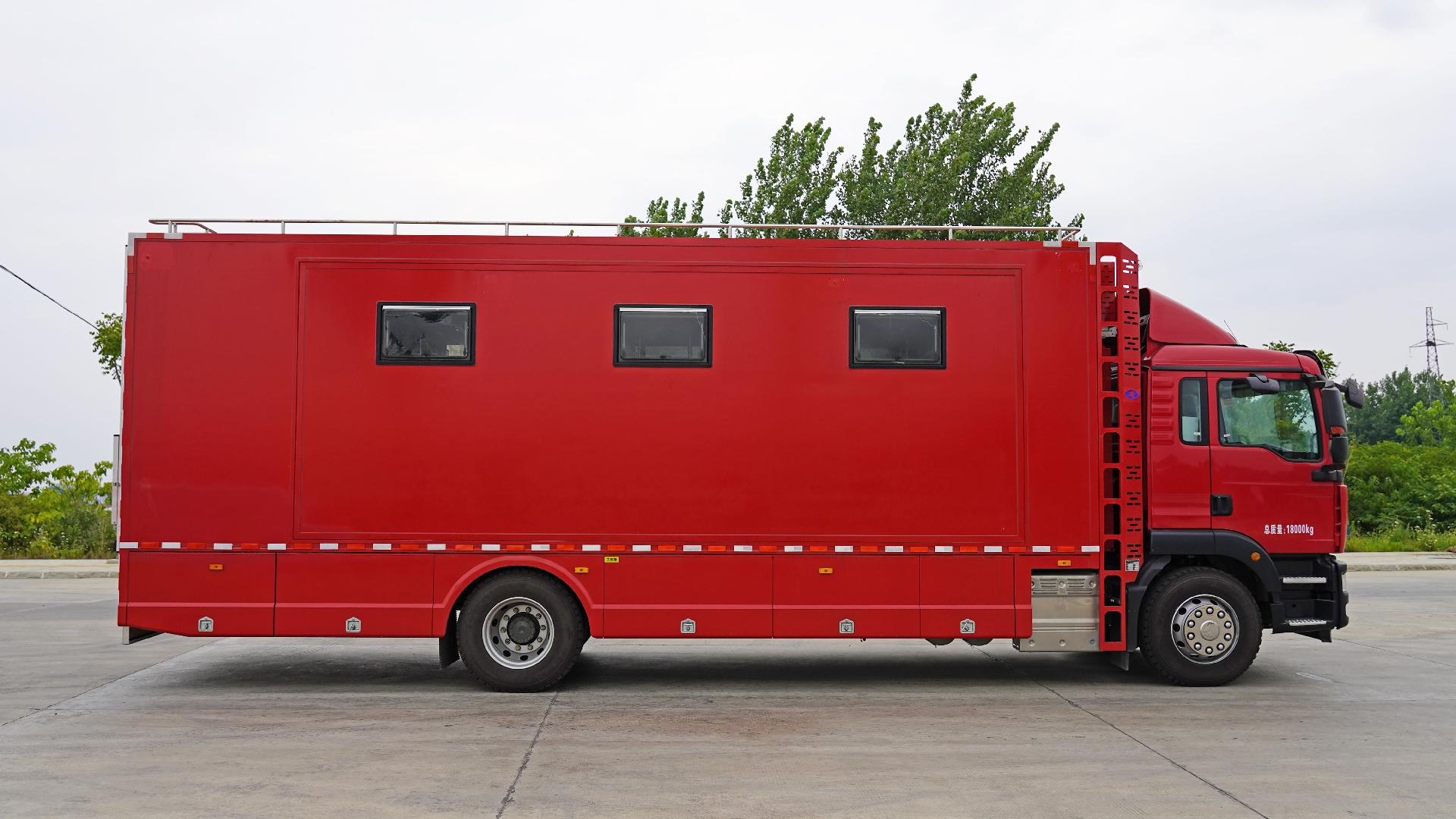 該車裝備有折疊床鋪,衛(wèi)浴等具有野外宿營保障功能的專用裝置,主要用于野外宿營.該車廂體頂部封閉,不可開啟.停車作業(yè)時(shí)車廂可向外拓展.后部安裝作業(yè)照明燈,該燈用于作業(yè)時(shí)照明,只能在車輛切換為作業(yè)狀態(tài)時(shí)使用.側(cè)面防護(hù)采用裙板結(jié)構(gòu),后下部防護(hù)裝置材料:Q235B,連接方式:采用螺栓連接,后部防護(hù)斷面尺寸(mm)140×50,后部防護(hù)離地高度(mm):400.選裝限速裝置,限速80km/h,89km/h,ABS系統(tǒng)控制器生產(chǎn)企業(yè)/型號(hào)為采埃孚商用車系統(tǒng)(青島)有限公司/4460046300;選裝EBS,EBS系統(tǒng)控制器生產(chǎn)企業(yè)/型號(hào)為采埃孚商用車系統(tǒng)(青島)有限公司/EBS3.整車長/軸距/后懸對(duì)應(yīng)關(guān)系為(mm):9700/5000/3250,9900/5200/3250,10300(10500)/5600/3250(3450),10500(10700)/5800/3250(3450),11000(11200)/6300/3250(3450).該車僅采用鋼板彈簧懸架.